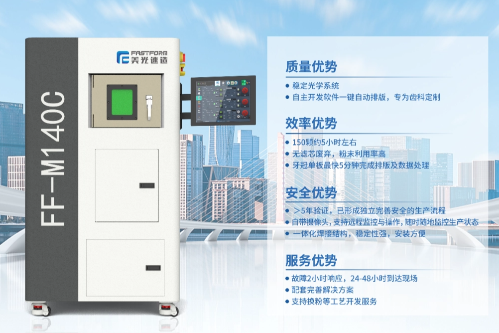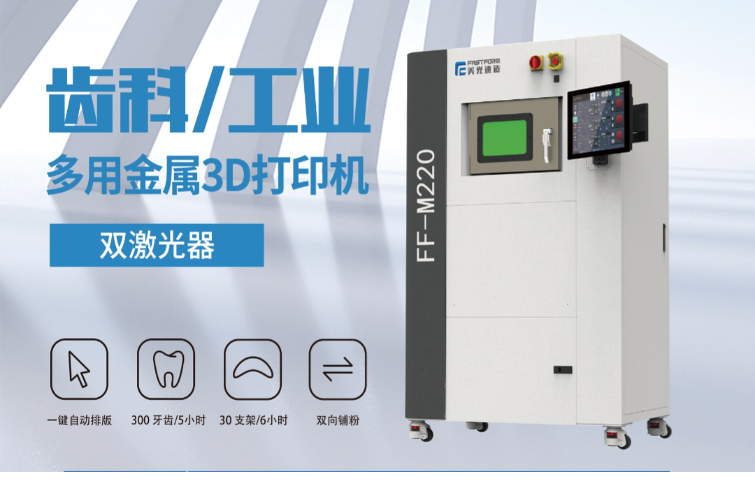 Разработанный компанией FastForm, FF-M220 — это двухлазерный 3D-принтер для металлической печати, поддерживающий печать различными порошковыми материалами и персонализированную печать. По сравнению с M140C, он имеет большую область печати и более высокую скорость печати, позволяя эффективно напечатать 300 коронок или 30 брекетов всего за 5 часов. Он оснащен программным обеспечением для обработки моделей FastLayer, которое позволяет одним щелчком мыши создавать макет зубной печати, а макет коронки на одной пластине занимает всего 5 минут. Это не только значительно сокращает время предварительной обработки 3D-печати, но и значительно упрощает эксплуатацию, позволяя пользователю управлять передней и задней частями изготовления зубных протезов одним человеком, без риска потери интеллектуальной собственности на протяжении всего процесса, что делает его высоко востребованным на внутреннем и внешнем рынках.