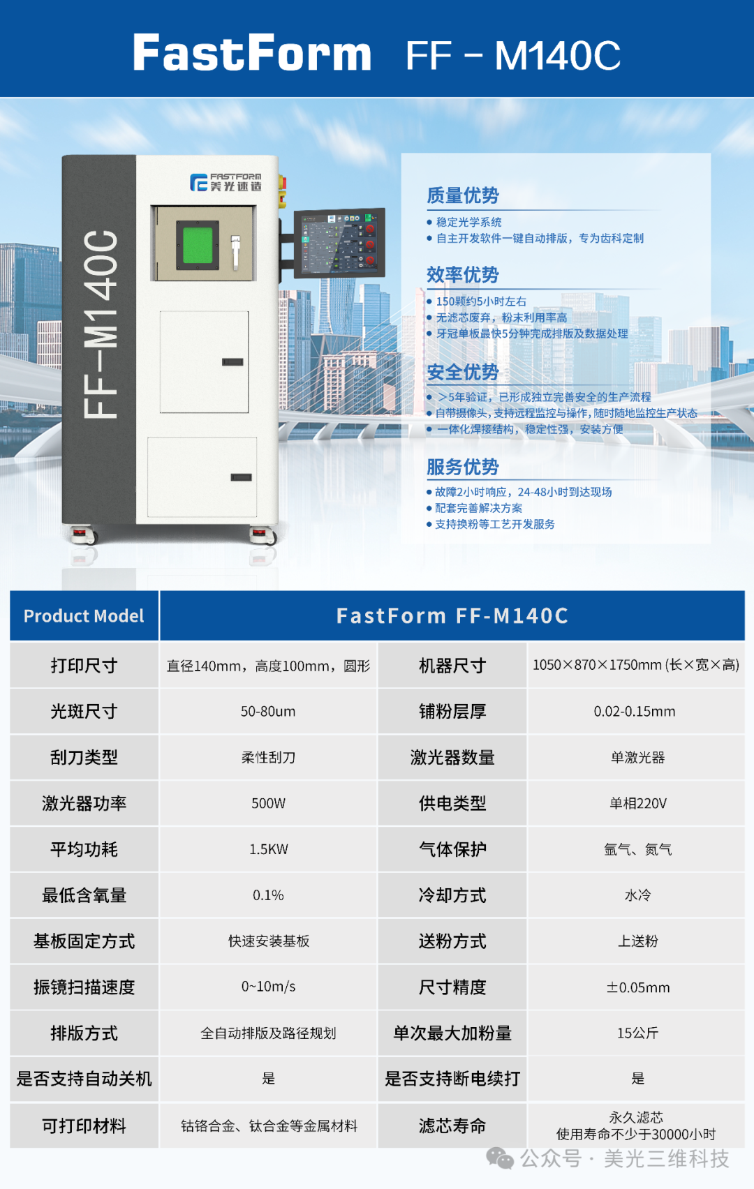 Стоматологический 3D-принтер FastForm для металла FF-140C занял лидирующие позиции на внутреннем рынке стоматологической продукции благодаря своей собственной разработке, системе макетирования в одно касание и стабильной оптической системе. По сравнению с аналогичными стоматологическими 3D-принтерами для металла, которые обычно печатают 150 коронок примерно за шесть часов, стоматологический 3D-принтер FastForm для металла благодаря уникальному механизму подачи порошка с верхней загрузкой значительно сокращает это время, позволяя производителям печатать 150 коронок всего за 4,5–5 часов. Благодаря сокращению времени печати производители могут изготавливать три лотка коронок в течение 24-часового производственного графика. Кроме того, собственная разработка FastForm, система макетирования в одно касание, позволяет производителям макетировать одну коронку всего за пять минут. По сравнению с другими устройствами, требующими ручной макетирования, это не только значительно сокращает время макетирования, но и упрощает эксплуатацию, делая ее еще более простой для начинающих пользователей, помогая производителям снижать затраты и повышать эффективность.