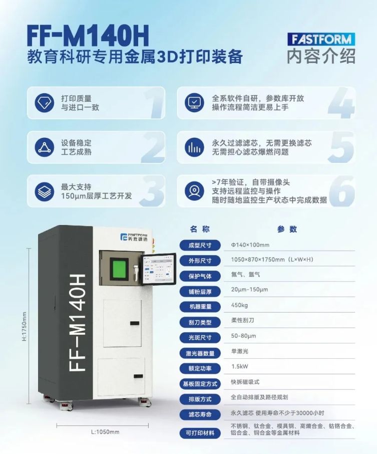 FF-M140H не только отвечает требованиям прецизионного производства, но и идеально подходит для нужд образования и научных исследований. После семи лет отраслевых испытаний оборудование показало стабильность работы, а процесс печати – отлаженность, что расширило границы применения 3D-печати металлом.