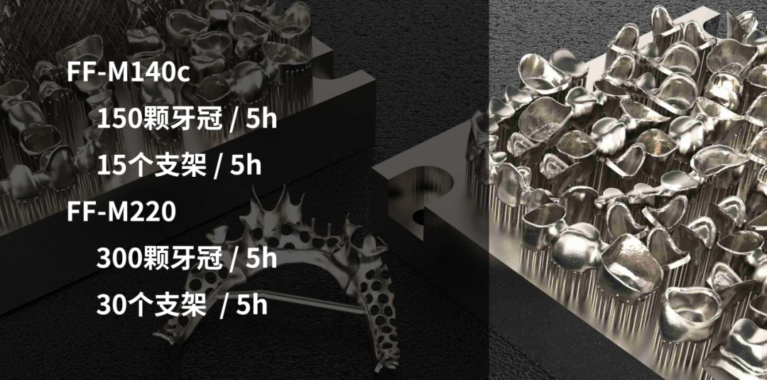 Серия 3D-принтеров FastForm Dental по металлу благодаря уникальной конструкции с верхней подачей порошка обеспечивает более высокую эффективность при 3D-печати металлических зубных протезов. По сравнению с другими конструкциями, верхняя подача порошка позволяет значительно сократить путь подачи порошка в оборудовании. Это позволяет не только эффективно предотвратить слипание и осаждение порошка, возникающие из-за большой длины пути, но и повысить эффективность печати.